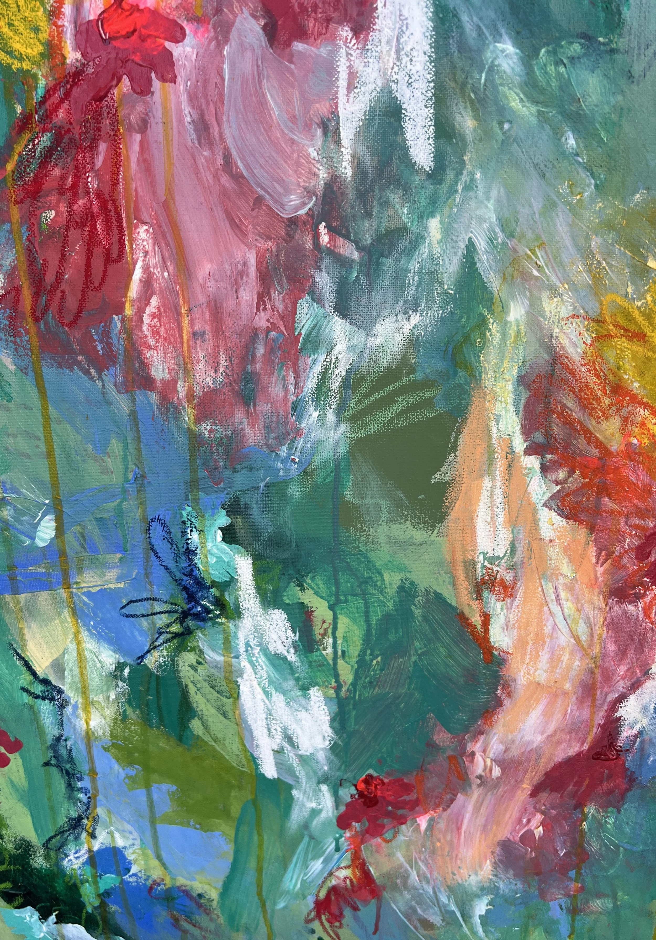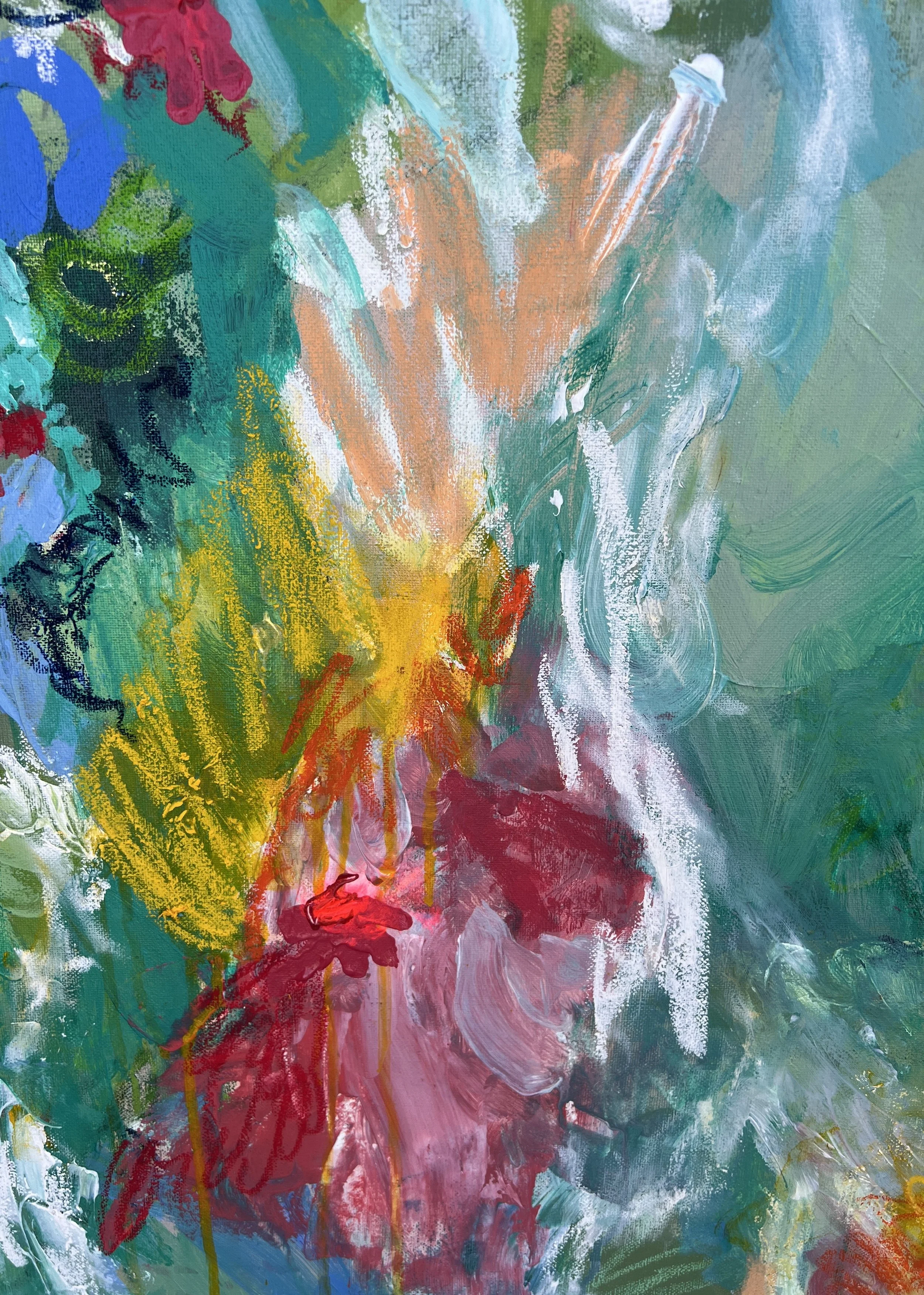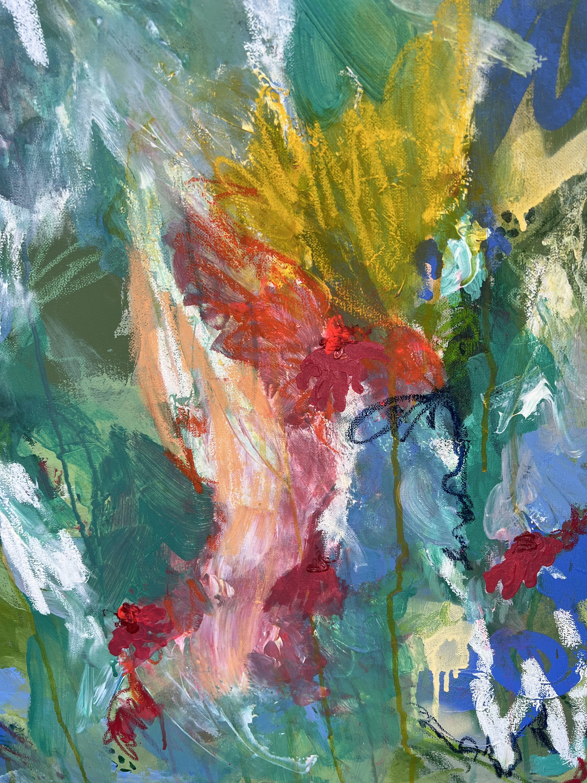Acrylic, oil pastel and paint pen on stretched canvas.
